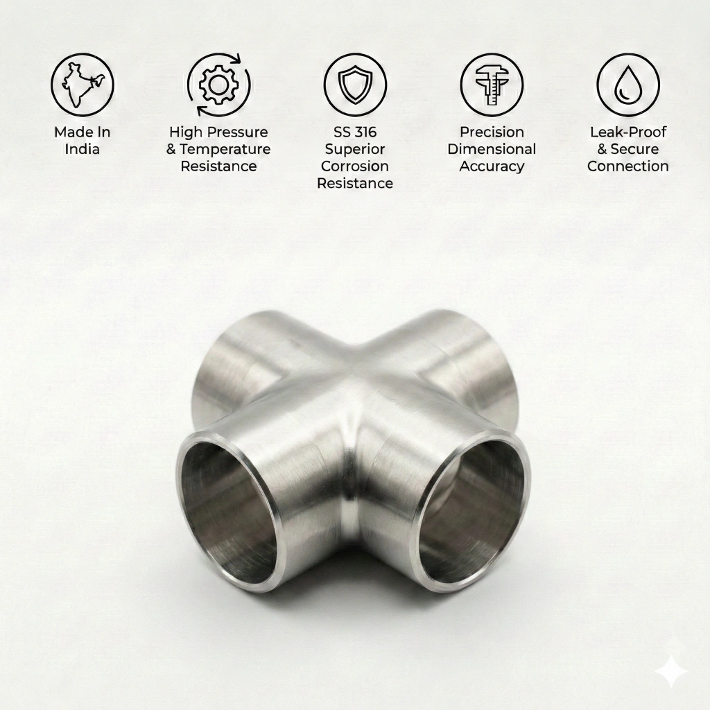 | Why choose SS 316 over SS 304 for cross fittings? | SS 316 offers significantly higher resistance to chlorides and acids due to the addition of molybdenum, making it essential for marine and chemical applications. |
